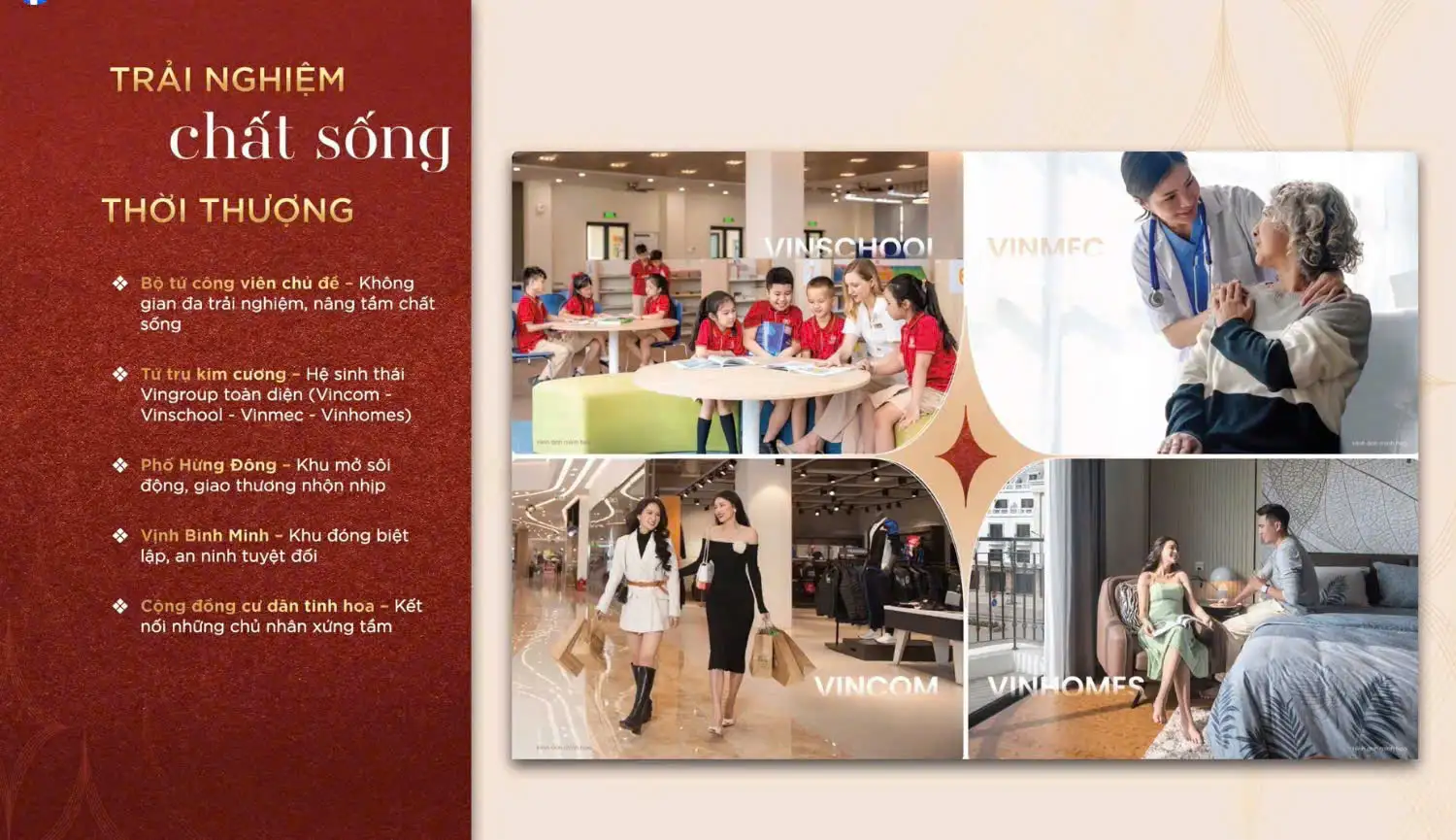 – TTM Vincom ,chăm sóc sức khỏe xông đá muối, sục khoáng, phòng khám tiêu chuẩn cao,Công viên giải trí (4.6ha) ,- Quảng trường sân khấu 350m²,Công viên thể thao (3.6ha), Bể bơi 1.200m², gym, pilates, bóng đá, golf, tennis ,